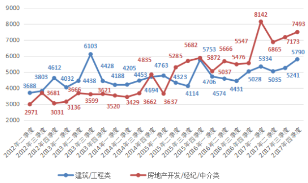 建筑企业要想在市场中取得竞争优势,已经不再局限于市场、资金、技术、管理等方面,人才的竞争上升到了战略地位,人才作为第一资源的主导作用越来越突出。建筑/工程类和房地产开发/经纪/中介类近年来职位供需旺盛,该类职位薪酬水平在市场中也处于领先的位置。其中建筑/工程类职位2017年第四季度达到5790元/月,与三季度相比增长10.48%。而业务类的房地产销售/置业顾问职位,业绩是考核其薪酬水平的主要标杆,因此该职位的薪酬浮动性非常大,倍受向往高薪、不拘泥于朝九晚五的年轻求职者追逐,用人单位仅提供一个普通达标水平的薪酬参考。2017年第四季度房地产开发/经纪/中介类职位平均薪酬达到7493元/月,与三季度相比增长4.46%。