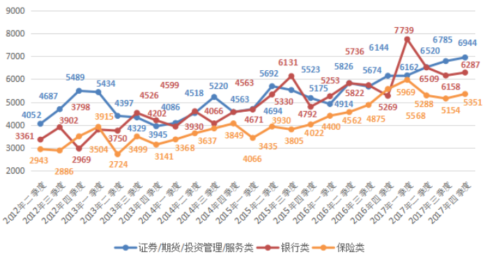 金融类职位供需容易受商业及股票市场周期的影响,2017年由于市场较低迷,该类职位供需均呈现不同程度的下滑。但在全民市场经济的氛围中,金融业的从业者可以感受到正在从事着一份“体面”的职业,且在各行业的薪酬横向比较中,金融业的平均薪酬与福利较高。2017年第四季度证券/期货/投资管理/服务类、银行类和保险类职位平均薪酬分别达到6944元/月、6287元/月和5351元/月,与三季度相比涨幅分别为2.34%、2.09%和3.82%。