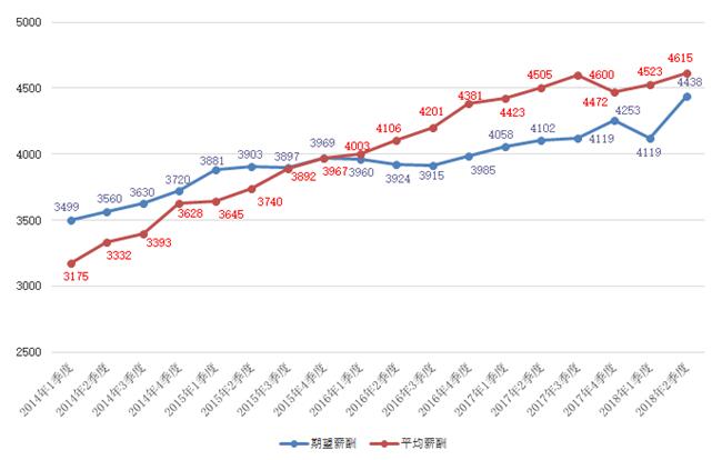 2018年第二季度广西人才网联系统中用人单位发布职位的平均薪酬(其定义见注4,下同)缓慢增长,为4615元/月,环比小幅增长2.03%,而求职者期望平均薪酬有快速增长趋势,达到4438元/月,环比上涨7.73%。用人单位提供的职位平均薪酬水平依旧比求职者的平均期望薪酬略高。