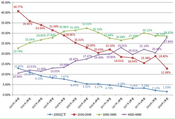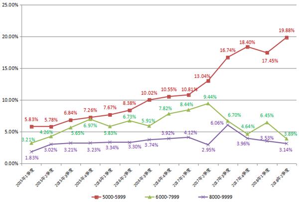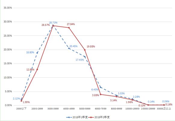由上图可见,5000-5999元/月区间的职位数量占比回升较为明显,2018年第二季度占比达到19.88%,环比增长2.43个百分比;而6000-7999元/月区间的职位数量占比本季度出现小幅下滑,下降至3.89%;8000-9999元/月区间的职位数量在2018年第二季度出现微跌,占比为3.14%,环比减少0.39个百分点。