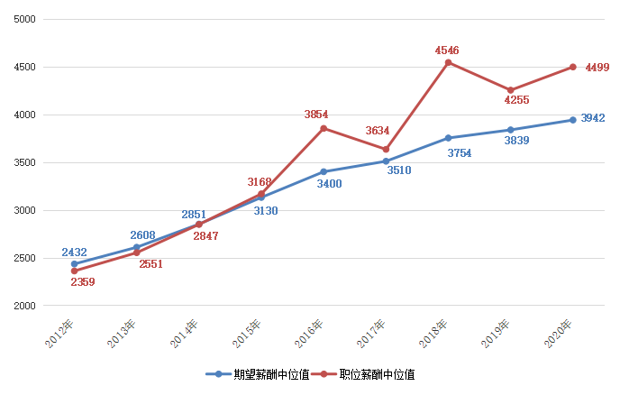 近九年求职者期望薪酬和用人单位发布职位薪酬中位值对比走势图如下: