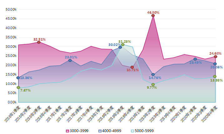 由上图可见,近五年3000-3999元/月、4000-4999元/月和5000-5999元/月三个薪酬区间为广西人才网中职位数量占比的主要薪酬区间。2020年,3000-3999元/月区间的职位数量占比曲线在2020年第一季度为当年最高点,第二、三季度稍有回落,第四季度回升至24.68%,环比增长1.37个百分点;4000-4999元/月区间的职位数量占比曲线在2020年第二季度达到本年度峰值,但第四季度回落至20.86%,环比减少1.52个百分点;5000-5999元/月区间的职位数量占比走势较为平稳,2020年第四季度为13.93%,环比增长1.06个百分点。