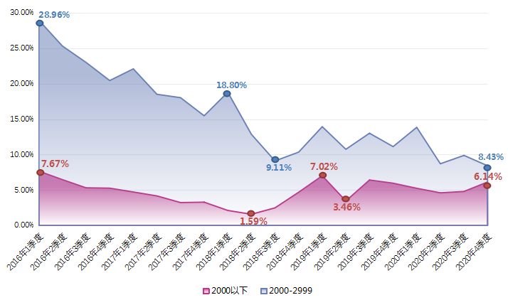 由上图可见,近五年2000元/月以下和2000-2999元/月较低薪酬区间呈现整体下滑趋势,2020年第四季度职位数量占比仅为6.14%和8.43%。
