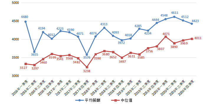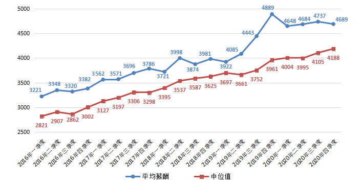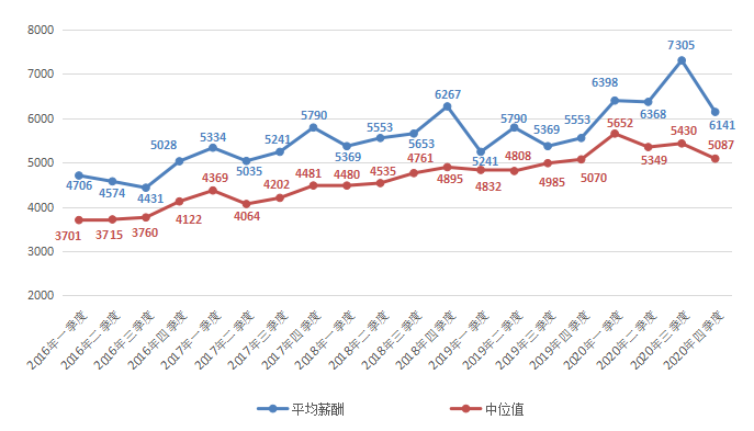 财务/税务/审计/统计类职位平均薪酬在2020年第四季度平均薪酬为4689元/月,环比微降1.01%。其中,中位值为4188元/月,环比增长2.02%。