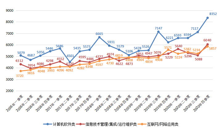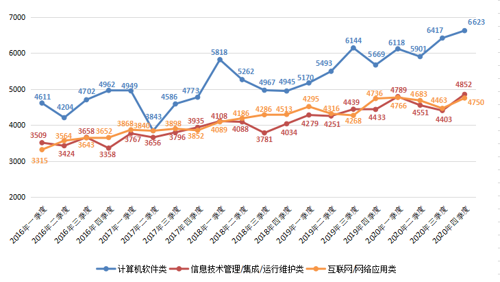 其中,计算机软件类、信息技术管理/集成/运行维护类和互联网/网络应用类职位薪酬中位值均在2020年第四季度达到历史新高,分别为6623元/月、4852元/月和4750元/月,环比分别增长3.21%、10.20%和6.44%。