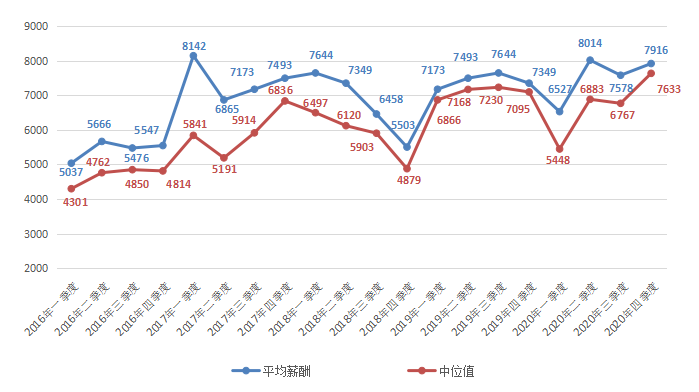 本年度房地产开发/经纪/中介类职位平均薪酬维持高位,2020年第四季度为7916元/月,环比增长4.46%。其中,中位值为7633元/月,环比增长12.80%。