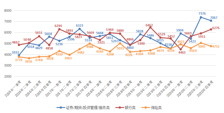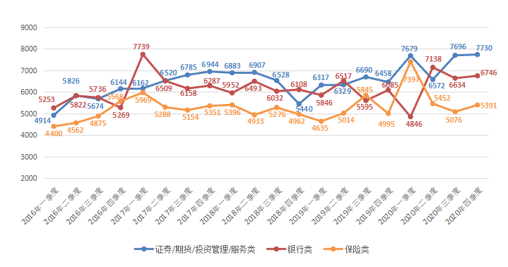 金融类职位中,证券/期货/投资管理/服务类、银行类和保险类职位2020年第四季度平均薪酬分别为7730元/月、6746元/月和5391元/月,环比增幅分别为0.44%、1.69%和6.21%。