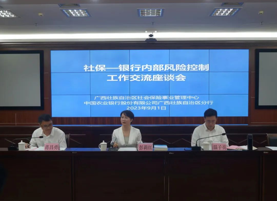 9月1日,根据自治区人力资源社会保障厅工作部署,自治区社保中心、中国农业银行广西区分行联合召开社保—银行内部风险控制工作交流座谈会。自治区社保中心党委书记、主任罗俊鑫,中国农业银行广西区分行高级专家、机构业务部总经理彭莉红出席会议。参会人员认真听取了中国农业银行广西区分行有关农业银行业务操作控制、内部控制管理、社银合作事项风险防范等内部风险控制工作的经验介绍,并进行了深入互动交流。
