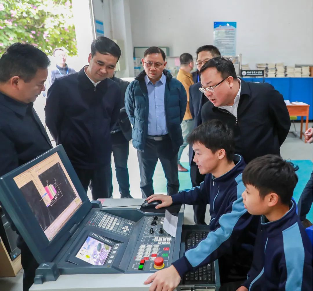 唐标文一行首先来到柳州市技工学校(革新校区),参观考察汽车整车装配实训基地、焊接实训基地、零部件制造加工中心、汽车发动机装配实训基地等9个融生产、教学、培训、鉴定为一体的综合服务实训基地,详细询问学校办学规模、毕业生就业率、实训基地建设、校企合作及工学一体化建设等情况,深入了解学校在技工教育、校企合作等方面遇到的问题与困难。唐标文对学校在工学一体化建设、一线技能人才培养方面取得的成效予以肯定。他指出,加强技能人才队伍建设,对增强核心竞争力和科技创新能力,缓解结构性就业矛盾具有重要意义,学校要深入学习贯彻习近平总书记关于技能人才工作的重要指示批示精神,全面落实立德树人根本任务,将学校发展规划与广西产业布局精准对接,动态调整优化专业设置,培养新能源汽车、数字经济等新兴产业的急需紧缺技能人才,深化校企合作,搭建校企沟通交流平台,不断推进广西技工教育提质增效,持续为地方经济高质量发展提供强大的技能人才支撑。