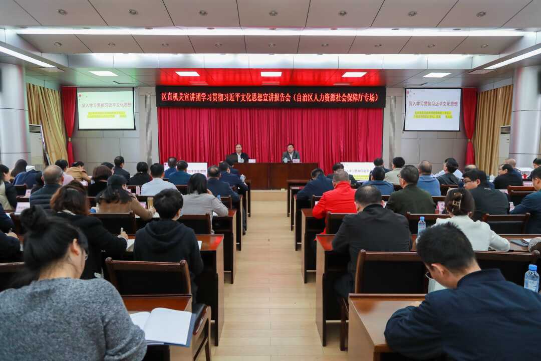 为深入学习贯彻习近平文化思想和习近平总书记关于宣传思想文化工作重要指示精神,12月13日上午,区直机关宣讲团学习贯彻习近平文化思想宣讲报告会(自治区人力资源社会保障厅专场)在自治区人力资源社会保障厅北楼六楼会议室举办,自治区党委讲师团特聘教授(专家)、广西社会科学院党组书记、院长陈立生到会作主题宣讲报告。自治区人力资源社会保障厅党组书记、厅长唐标文主持报告会。自治区直属机关工委宣传部、区直机关工委讲师团有关负责同志出席宣讲报告会。