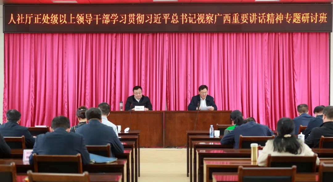 1月17日,自治区人力资源社会保障厅举办正处级以上领导干部学习贯彻习近平总书记视察广西重要讲话精神专题研讨班,深入学习贯彻习近平总书记对广西重大方略要求特别是习近平总书记视察广西重要讲话精神。研讨班采取专题授课与集中研讨相结合的形式开展,厅党组书记、厅长唐标文作动员部署讲话,厅党组副书记、副厅长袁国华主持研讨班。