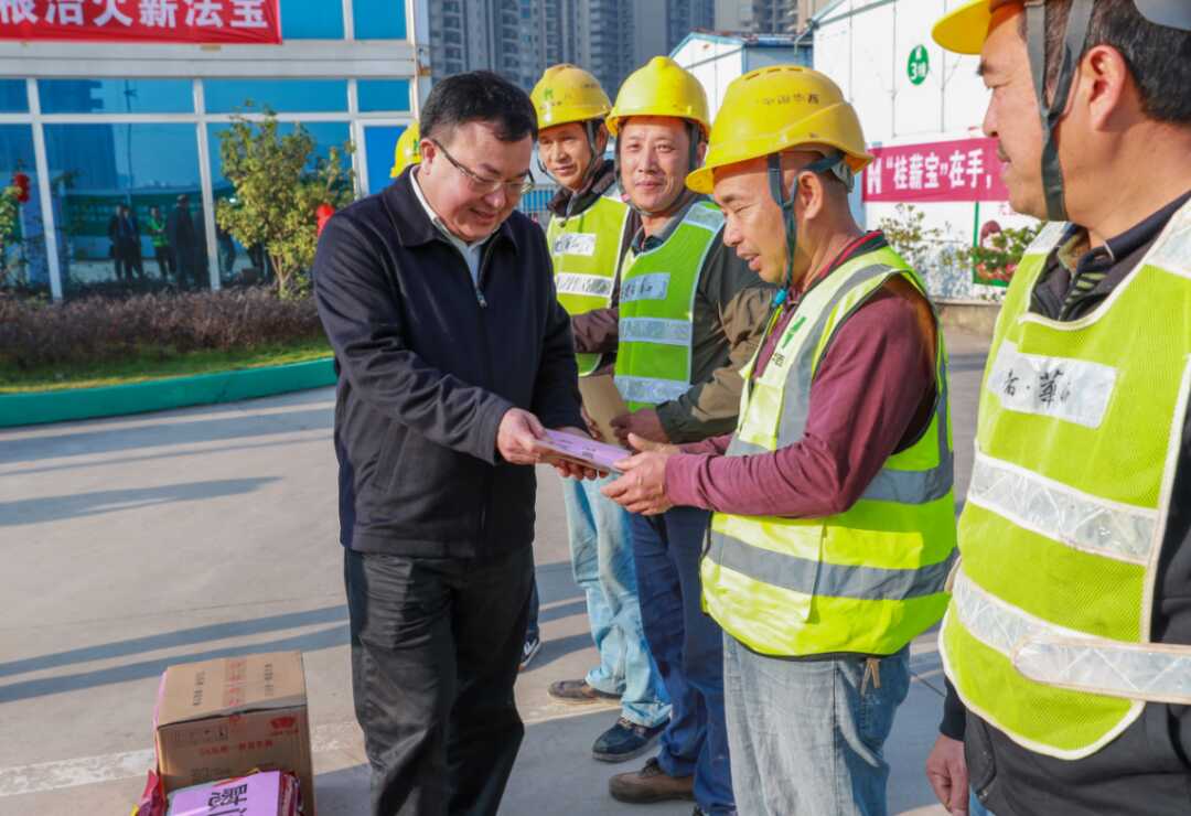 唐标文(左一)在中国华西万昌·东方河畔项目点向农民工发放慰问金和慰问品