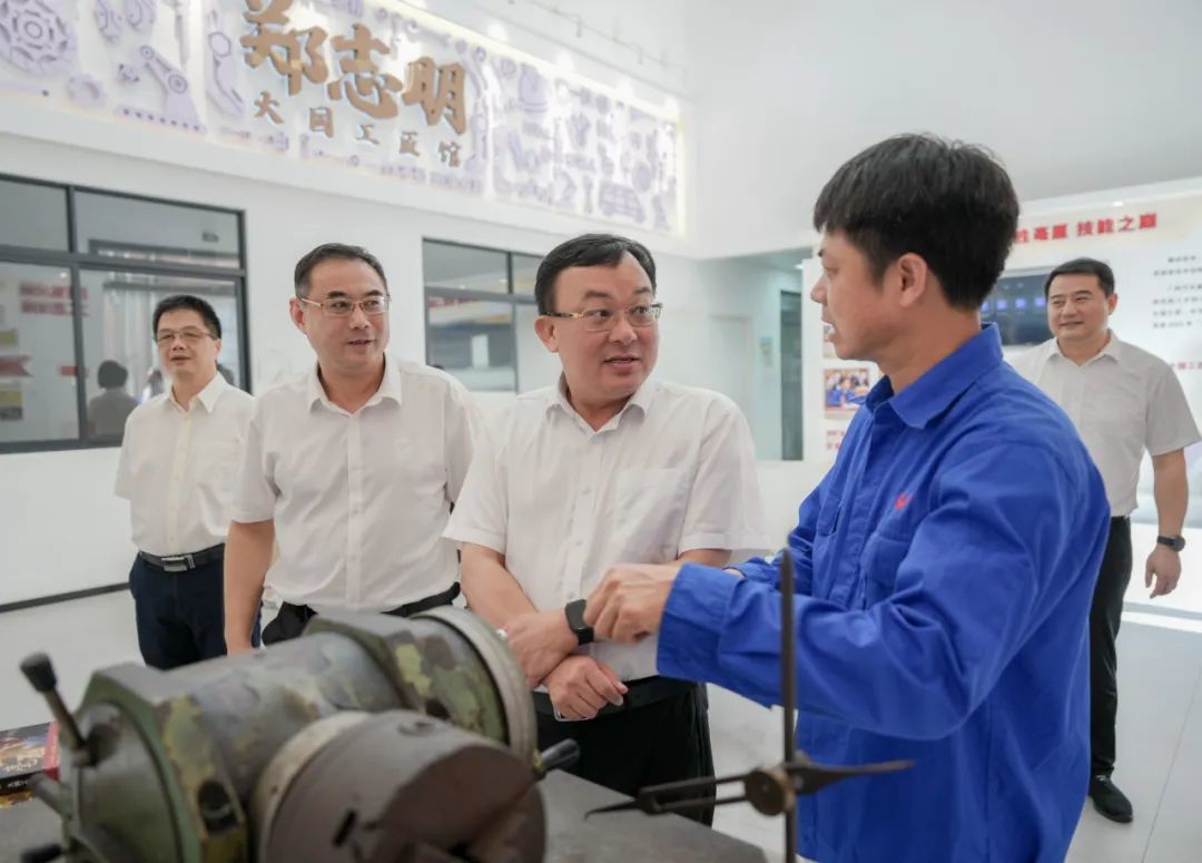 唐标文(中)在五菱工匠学院与广西汽车集团有限公司首席技能专家、“中华技能大奖”获得者、“大国工匠年度人物”郑志明沟通交流