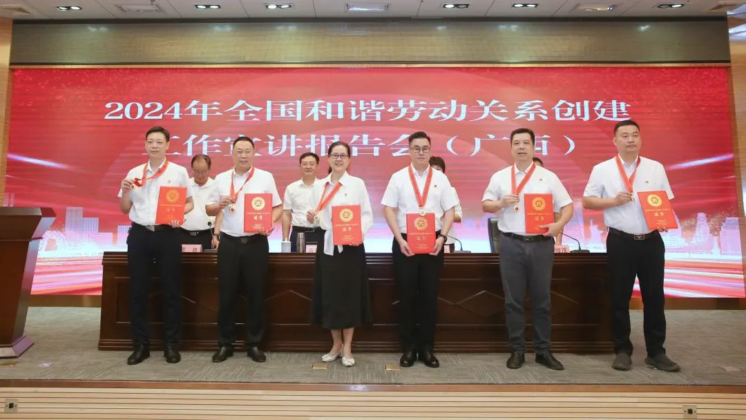 会上,自治区相关部门领导为广西受表彰的全国和谐劳动关系建工作集体和先个人颁发牌匾、证书、章。自治区人力源社会保障厅劳动关系、防城港市港口区沙潭江街道第一届全国和谐劳动关系建工作先集体,柳州市工会韦红革等8人荣第一届全国和谐劳动关系建工作先个人,6名先个人代表作事迹宣。